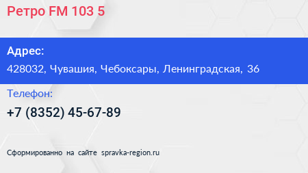 Ретро, FM 103.5 по адресу 428032, Чувашия, Чебоксары, Ленинградская, 36 в дальнейшем Организация, размещена в следующих категориях: