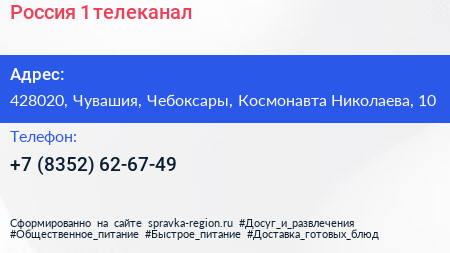 Россия-1, телеканал по адресу 428020, Чувашия, Чебоксары, Космонавта Николаева, 10 в дальнейшем Организация, размещена в следующих категориях: