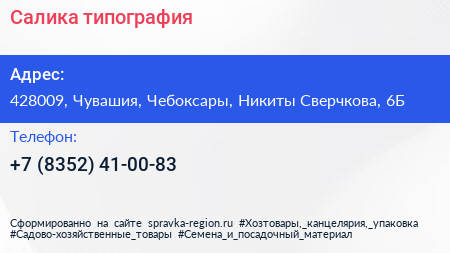 Салика, типография по адресу 428009, Чувашия, Чебоксары, Никиты Сверчкова, 6Б в дальнейшем Организация, размещена в следующих категориях: