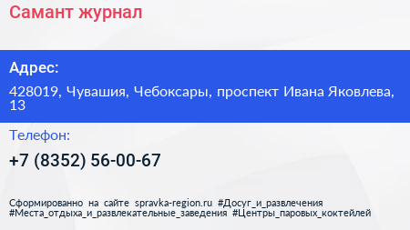 Самант, журнал по адресу 428019, Чувашия, Чебоксары, проспект Ивана Яковлева, 13 в дальнейшем Организация, размещена в следующих категориях: