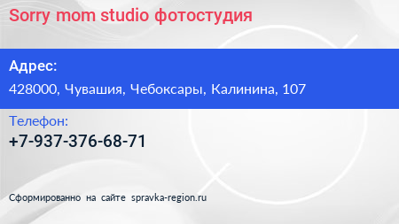 Sorry mom studio, фотостудия по адресу 428000, Чувашия, Чебоксары, Калинина, 107 в дальнейшем Организация, размещена в следующих категориях: