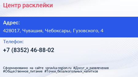 Центр расклейки по адресу 428017, Чувашия, Чебоксары, Гузовского, 4 в дальнейшем Организация, размещена в следующих категориях: