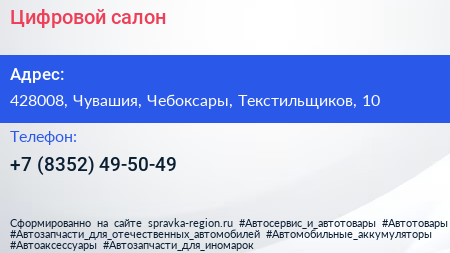 Цифровой салон по адресу 428008, Чувашия, Чебоксары, Текстильщиков, 10 в дальнейшем Организация, размещена в следующих категориях: