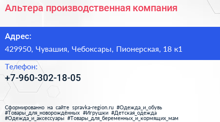 Альтера, производственная компания по адресу 429950, Чувашия, Чебоксары, Пионерская, 18 к1 в дальнейшем Организация, размещена в следующих категориях: