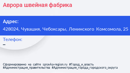 Аврора, швейная фабрика по адресу 428024, Чувашия, Чебоксары, Ленинского Комсомола, 25 в дальнейшем Организация, размещена в следующих категориях: