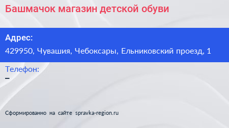 Башмачок, магазин детской обуви по адресу 429950, Чувашия, Чебоксары, Ельниковский проезд, 1 в дальнейшем Организация, размещена в следующих категориях: