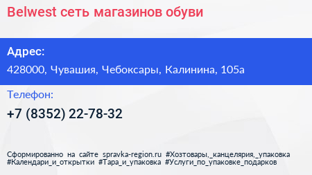 Belwest, сеть магазинов обуви по адресу 428000, Чувашия, Чебоксары, Калинина, 105а в дальнейшем Организация, размещена в следующих категориях:
