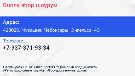 Bunny shop, шоурум по адресу 428020, Чувашия, Чебоксары, Энгельса, 40 в дальнейшем Организация, размещена в следующих категориях: