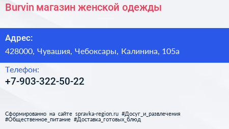 Burvin, магазин женской одежды по адресу 428000, Чувашия, Чебоксары, Калинина, 105а в дальнейшем Организация, размещена в следующих категориях: