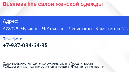 Business line, салон женской одежды по адресу 428029, Чувашия, Чебоксары, Ленинского Комсомола, 21а в дальнейшем Организация, размещена в следующих категориях: