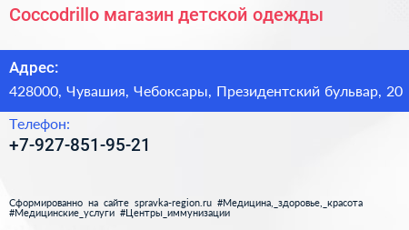 Coccodrillo, магазин детской одежды по адресу 428000, Чувашия, Чебоксары, Президентский бульвар, 20 в дальнейшем Организация, размещена в следующих категориях: