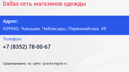 Dallas, сеть магазинов одежды по адресу 429960, Чувашия, Чебоксары, Первомайская, 49 в дальнейшем Организация, размещена в следующих категориях: