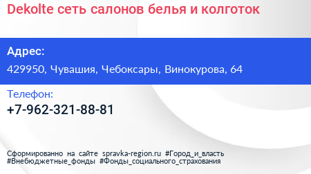 Dekolte, сеть салонов белья и колготок по адресу 429950, Чувашия, Чебоксары, Винокурова, 64 в дальнейшем Организация, размещена в следующих категориях:
