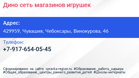Дино, сеть магазинов игрушек по адресу 429959, Чувашия, Чебоксары, Винокурова, 46 в дальнейшем Организация, размещена в следующих категориях: