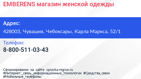 EMBERENS, магазин женской одежды по адресу 428003, Чувашия, Чебоксары, Карла Маркса, 52/1 в дальнейшем Организация, размещена в следующих категориях: