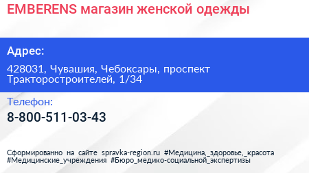 EMBERENS, магазин женской одежды по адресу 428031, Чувашия, Чебоксары, проспект Тракторостроителей, 1/34 в дальнейшем Организация, размещена в следующих категориях: