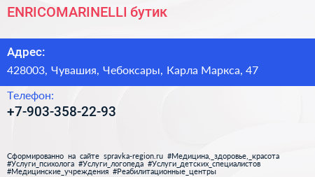 ENRICOMARINELLI, бутик по адресу 428003, Чувашия, Чебоксары, Карла Маркса, 47 в дальнейшем Организация, размещена в следующих категориях: