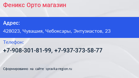 Феникс-Орто, магазин по адресу 428023, Чувашия, Чебоксары, Энтузиастов, 23 в дальнейшем Организация, размещена в следующих категориях: