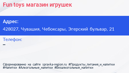 Fun toys, магазин игрушек по адресу 428027, Чувашия, Чебоксары, Эгерский бульвар, 21 в дальнейшем Организация, размещена в следующих категориях: