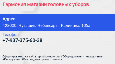 Гармония, магазин головных уборов по адресу 428000, Чувашия, Чебоксары, Калинина, 105а в дальнейшем Организация, размещена в следующих категориях: