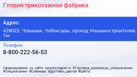 Глория, трикотажная фабрика по адресу 428022, Чувашия, Чебоксары, проезд Машиностроителей, 1ш в дальнейшем Организация, размещена в следующих категориях: