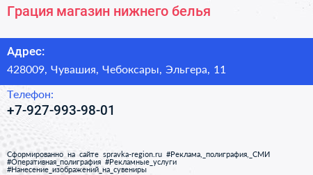 Грация, магазин нижнего белья по адресу 428009, Чувашия, Чебоксары, Эльгера, 11 в дальнейшем Организация, размещена в следующих категориях:
