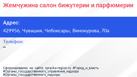 Жемчужина, салон бижутерии и парфюмерии по адресу 429956, Чувашия, Чебоксары, Винокурова, 70а в дальнейшем Организация, размещена в следующих категориях: