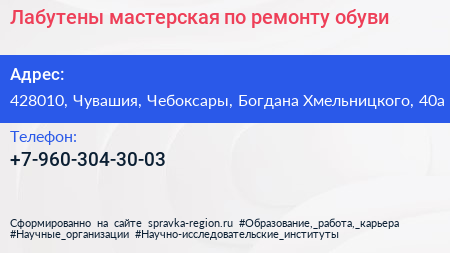 Лабутены, мастерская по ремонту обуви по адресу 428010, Чувашия, Чебоксары, Богдана Хмельницкого, 40а в дальнейшем Организация, размещена в следующих категориях: