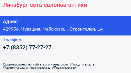 Линзбург, сеть салонов оптики по адресу 429956, Чувашия, Чебоксары, Строителей, 14 в дальнейшем Организация, размещена в следующих категориях: