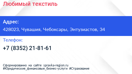 Любимый текстиль по адресу 428023, Чувашия, Чебоксары, Энтузиастов, 34 в дальнейшем Организация, размещена в следующих категориях:
