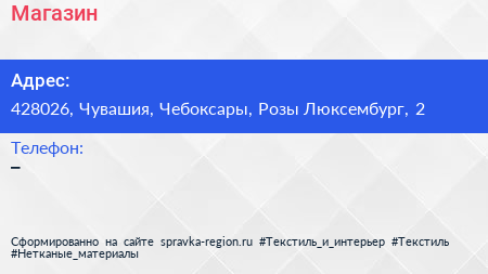 Магазин по адресу 428026, Чувашия, Чебоксары, Розы Люксембург, 2 в дальнейшем Организация, размещена в следующих категориях: