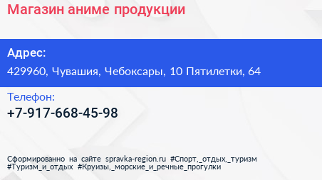 Магазин аниме-продукции по адресу 429960, Чувашия, Чебоксары, 10 Пятилетки, 64 в дальнейшем Организация, размещена в следующих категориях: