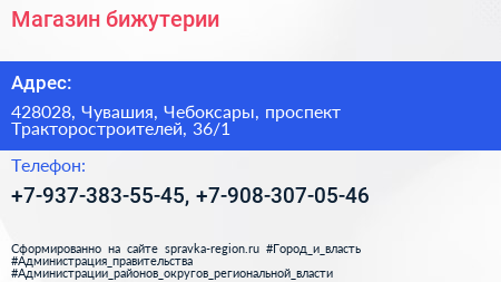 Магазин бижутерии по адресу 428028, Чувашия, Чебоксары, проспект Тракторостроителей, 36/1 в дальнейшем Организация, размещена в следующих категориях: