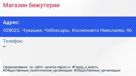 Магазин бижутерии по адресу 428022, Чувашия, Чебоксары, Космонавта Николаева, 46 в дальнейшем Организация, размещена в следующих категориях: