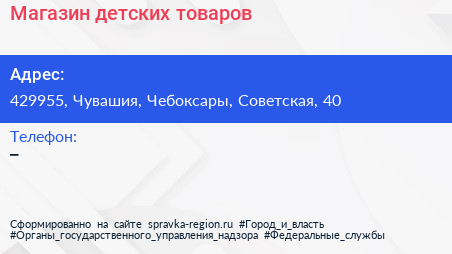 Магазин детских товаров по адресу 429955, Чувашия, Чебоксары, Советская, 40 в дальнейшем Организация, размещена в следующих категориях: