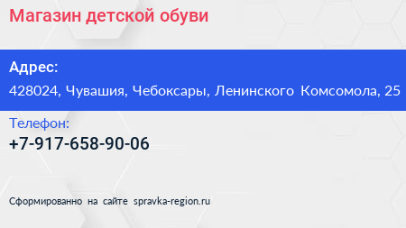 Магазин детской обуви по адресу 428024, Чувашия, Чебоксары, Ленинского Комсомола, 25 в дальнейшем Организация, размещена в следующих категориях: