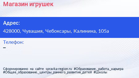 Магазин игрушек по адресу 428000, Чувашия, Чебоксары, Калинина, 105а в дальнейшем Организация, размещена в следующих категориях: