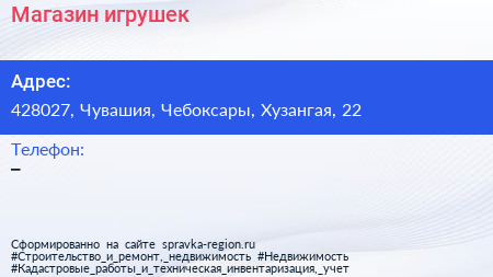 Магазин игрушек по адресу 428027, Чувашия, Чебоксары, Хузангая, 22 в дальнейшем Организация, размещена в следующих категориях: