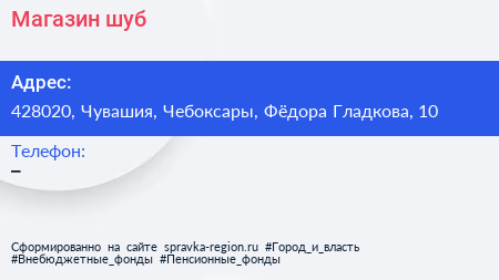 Магазин шуб по адресу 428020, Чувашия, Чебоксары, Фёдора Гладкова, 10 в дальнейшем Организация, размещена в следующих категориях: