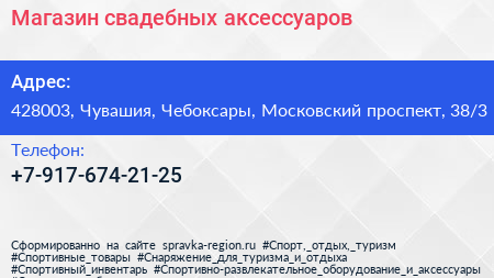 Магазин свадебных аксессуаров по адресу 428003, Чувашия, Чебоксары, Московский проспект, 38/3 в дальнейшем Организация, размещена в следующих категориях: