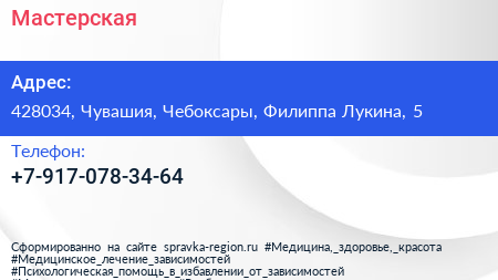 Мастерская по адресу 428034, Чувашия, Чебоксары, Филиппа Лукина, 5 в дальнейшем Организация, размещена в следующих категориях:
