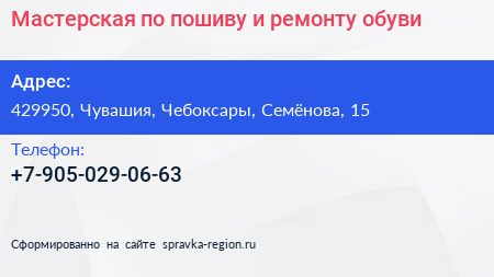 Мастерская по пошиву и ремонту обуви по адресу 429950, Чувашия, Чебоксары, Семёнова, 15 в дальнейшем Организация, размещена в следующих категориях: