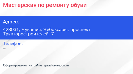Мастерская по ремонту обуви по адресу 428031, Чувашия, Чебоксары, проспект Тракторостроителей, 7 в дальнейшем Организация, размещена в следующих категориях: