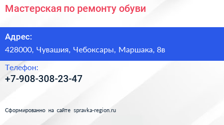 Мастерская по ремонту обуви по адресу 428000, Чувашия, Чебоксары, Маршака, 8в в дальнейшем Организация, размещена в следующих категориях: