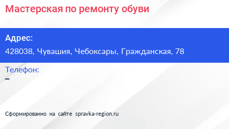 Мастерская по ремонту обуви по адресу 428038, Чувашия, Чебоксары, Гражданская, 78 в дальнейшем Организация, размещена в следующих категориях: