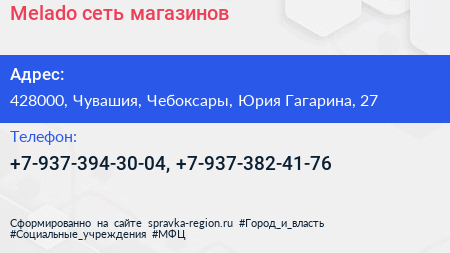 Melado, сеть магазинов по адресу 428000, Чувашия, Чебоксары, Юрия Гагарина, 27 в дальнейшем Организация, размещена в следующих категориях: