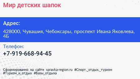 Мир детских шапок по адресу 428000, Чувашия, Чебоксары, проспект Ивана Яковлева, 4Б в дальнейшем Организация, размещена в следующих категориях: