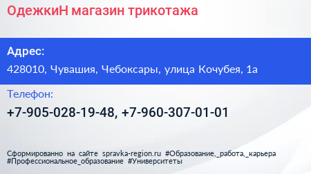 ОдежкиН, магазин трикотажа по адресу 428010, Чувашия, Чебоксары, улица Кочубея, 1а в дальнейшем Организация, размещена в следующих категориях: