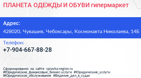 ПЛАНЕТА ОДЕЖДЫ И ОБУВИ, гипермаркет по адресу 428020, Чувашия, Чебоксары, Космонавта Николаева, 14Б в дальнейшем Организация, размещена в следующих категориях: