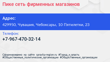 Пике, сеть фирменных магазинов по адресу 429950, Чувашия, Чебоксары, 10 Пятилетки, 23 в дальнейшем Организация, размещена в следующих категориях: